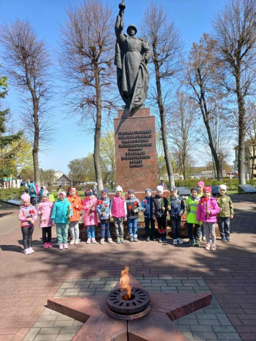Предложите ребенку рассмотреть братскую могилу с Вечным огнем. Обратите внимание, что Вечный огонь в небольшом городском сквере по улице Пушкина в Слониме горит с 1965 года. Его привезли из Брестской крепости к подножию памятника, где установлена скульптура молодого бойца с поднятым к небу автоматом в одной руке и знаменем — в другой. По периметру — гранитные плиты с именами погибших воинов. Память о ратном подвиге героев свято чтут слонимчане.