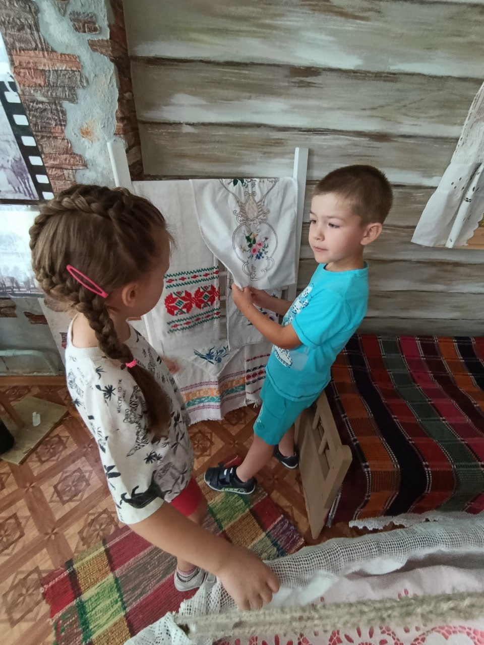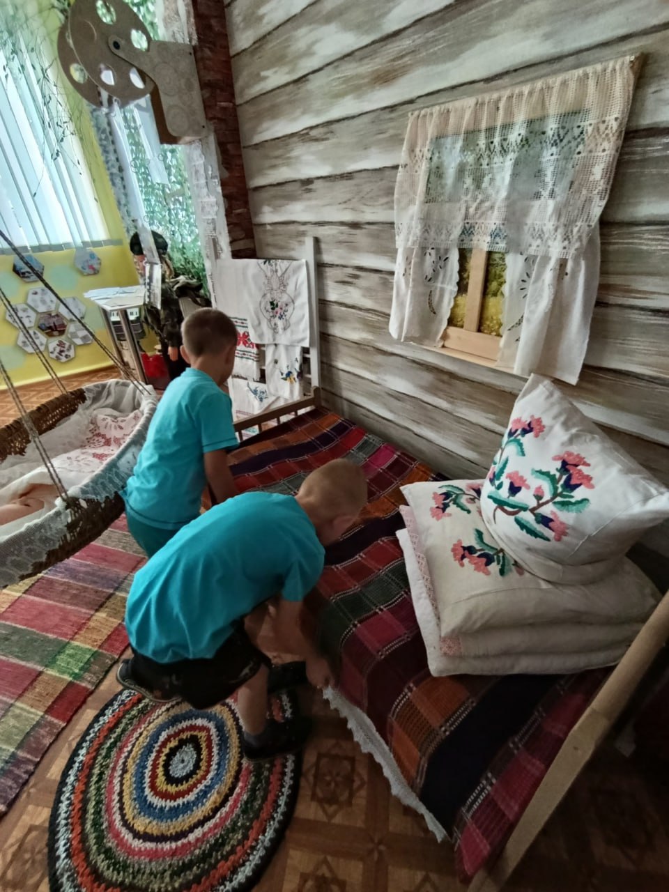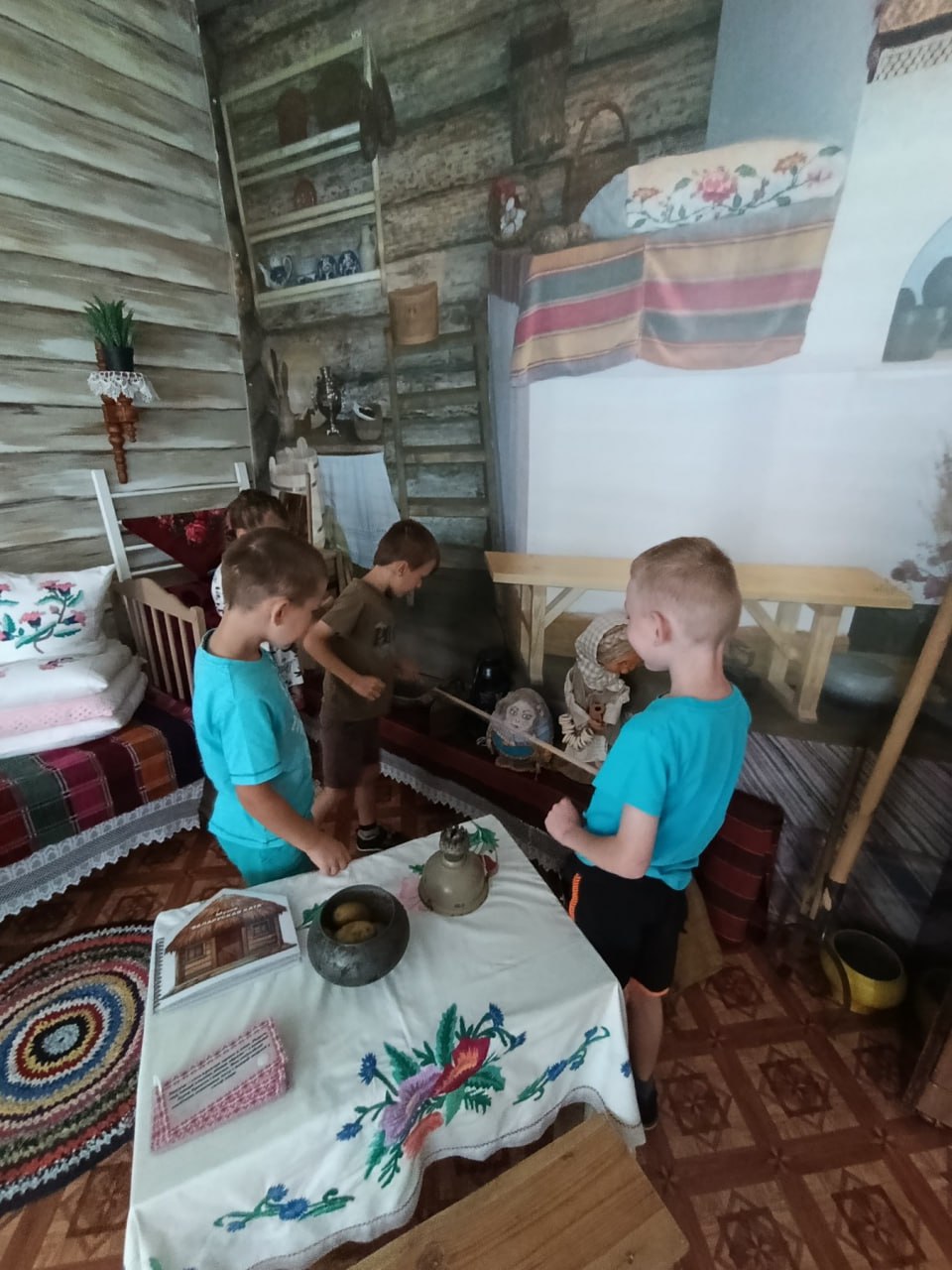 Комната встречает малышей атмосферой тепла и уюта. Стены украшают красочные рушники с традиционными орнаментами, словно страницы древних летописей. В центре экспозиции – старинная печь, символ домашнего очага и семейных ценностей. Рядом с ней – деревянная лавка, приглашающая присесть и послушать увлекательные истории о прошлом.