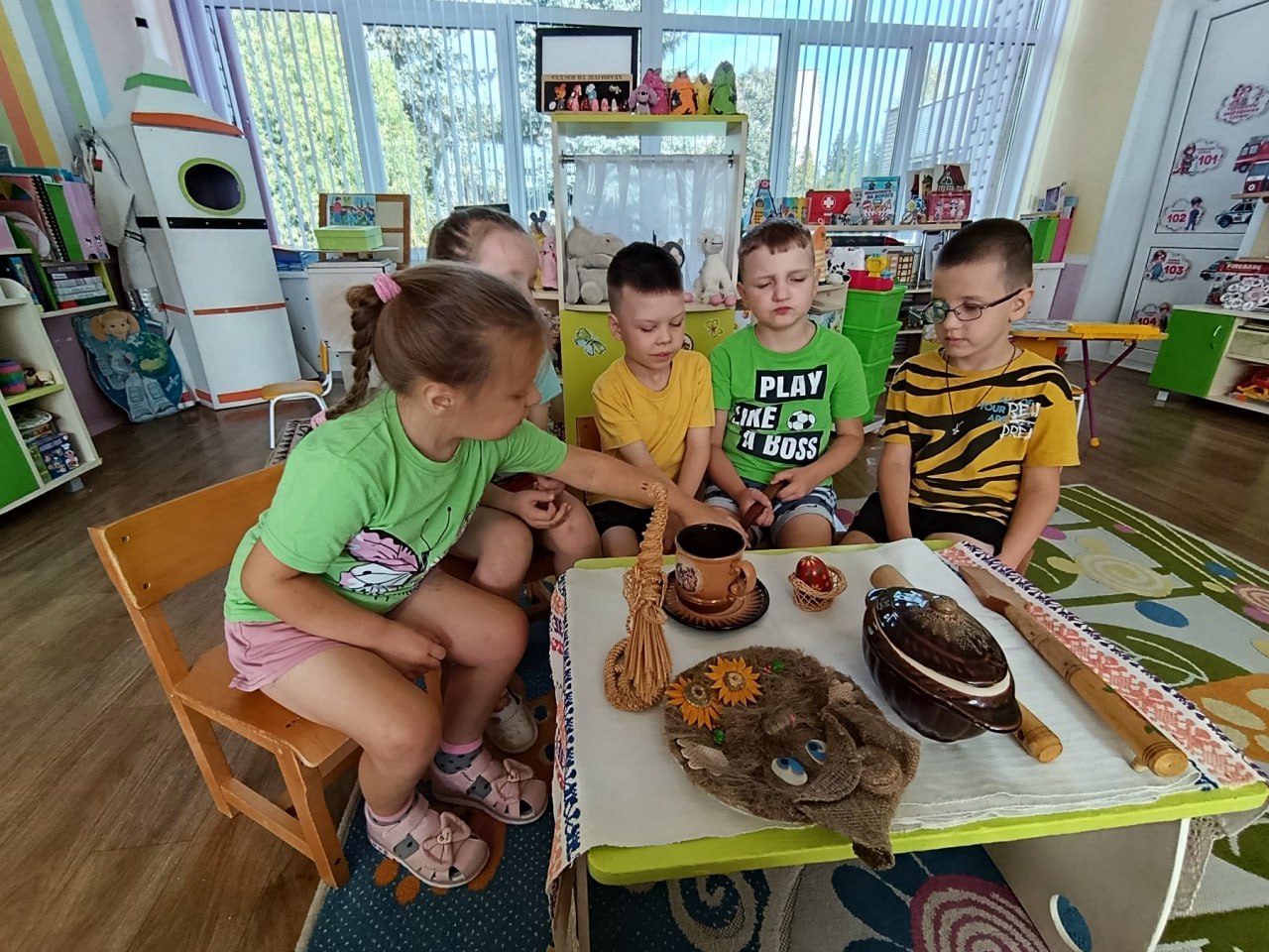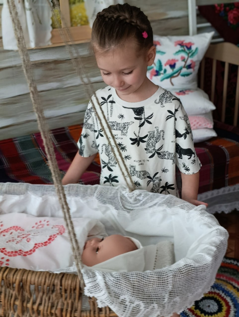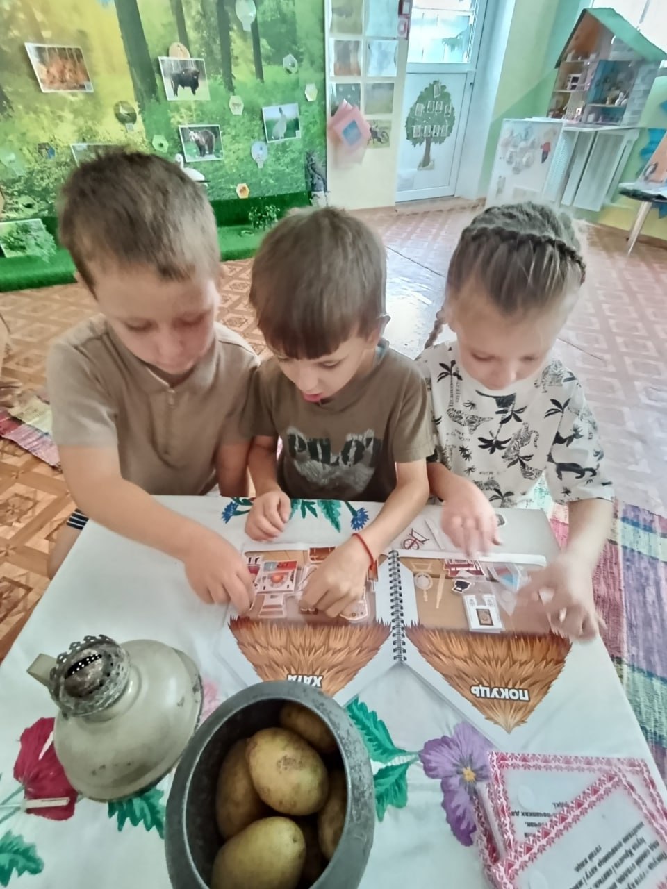 Комната встречает малышей атмосферой тепла и уюта. Стены украшают красочные рушники с традиционными орнаментами, словно страницы древних летописей. В центре экспозиции – старинная печь, символ домашнего очага и семейных ценностей. Рядом с ней – деревянная лавка, приглашающая присесть и послушать увлекательные истории о прошлом.